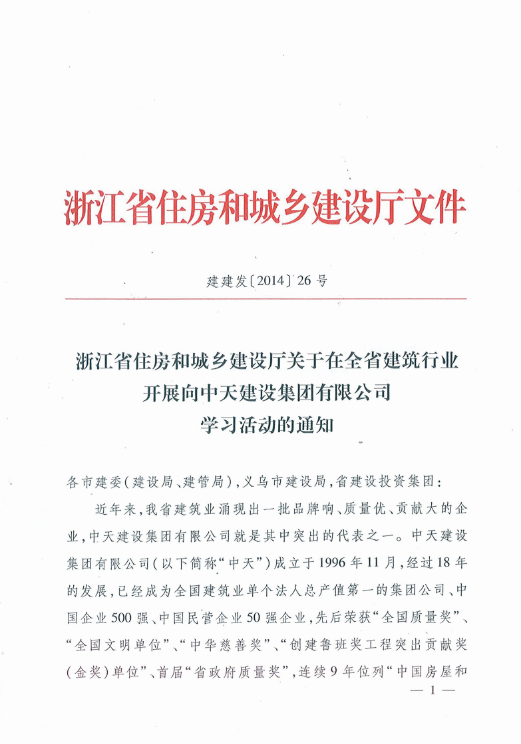 《浙江省住房和城乡建设厅关于在全省建筑行业开展向3003新葡的京建设集团有限公司学习活动的通知》